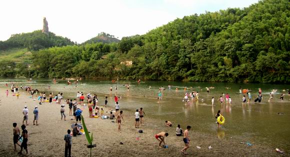 游览避暑上崀山 天然浴场人如潮。7月18日,崀山“将军石”景区前300多米长的河岸砂滩上,数百名游人在“天然浴场”中尽情洗浴避暑,享受着大自然的清凉乐趣。近段,高温酷暑难挡,每天自驾车前往“天然浴场”洗浴者多达上千人,整个景区人流车辆爆满,场面慰为壮观。 (郑国华/摄影报道)