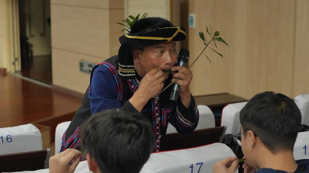 杨昌鑫还演示了如何用树叶模仿各种声音,甚至用不同种类的树叶吹奏出音色各异的乐曲。他解释道,树叶的选择、放置的位置、口型的变化以及气息的强弱,都是决定音色与音准的关键。高超的技艺、生动的演绎,让抽象的“非遗”概念化为了可听、可感的动人旋律,深深震撼了在场的每一位听众。