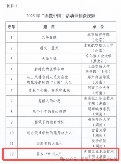 湖南日报·新湖南客户端12月5日讯(通讯员 陈嘉琪 袁余俊明)近日,教育部关心下一代工作委员会公布2025年“读懂中国”活动入选作品名单。邵阳工业职院首次参与此项全国性活动,成功斩获多项荣誉,选送的微视频作品《苗乡“种书人”》荣获最佳微视频奖项,邵阳工业职院获评“表扬单位”。
